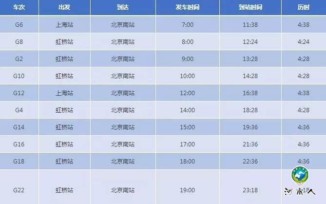上海虹桥(上海)至北京南的10列“复兴号”列车均为整点开行,具体为7点、8点、9点、10点、12点、14点、15点、17点、18点、19点。